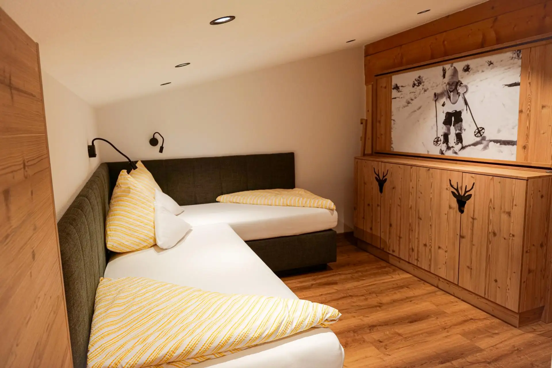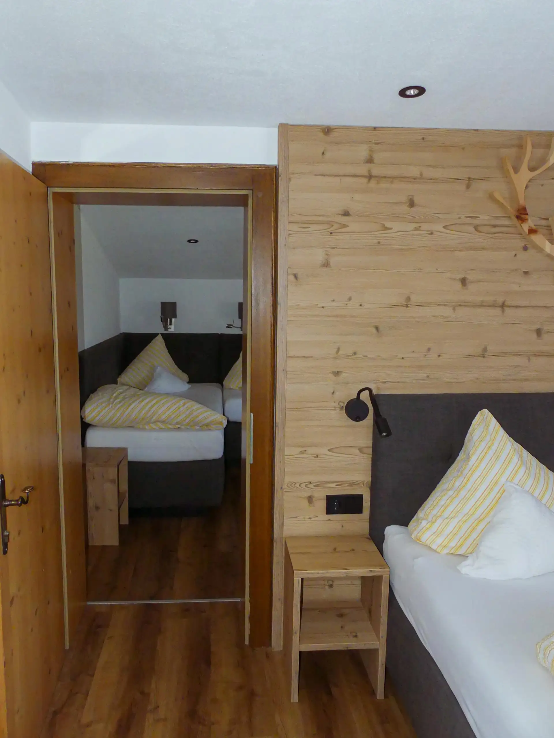 Our family rooms provide ample space for the whole family, featuring 2 separate bedrooms and 1 shared bathroom equipped with a shower/WC, toiletries, and a hairdryer. From the balcony, you can enjoy stunning views of the surrounding mountains of the Tiroler Zugspitz Arena.